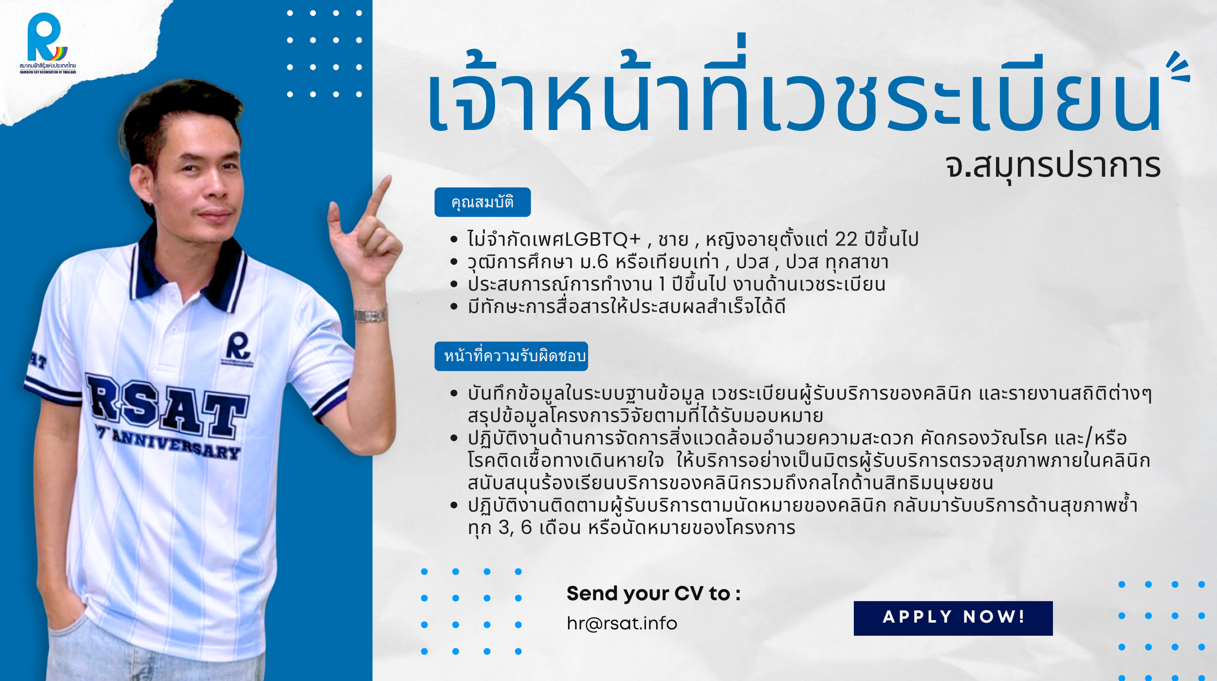 สนใจร่วมงานกับสมาคมฟ้าสีรุ้งแห่งประเทศไทย ส่งประวัติการทำงานได้ที่