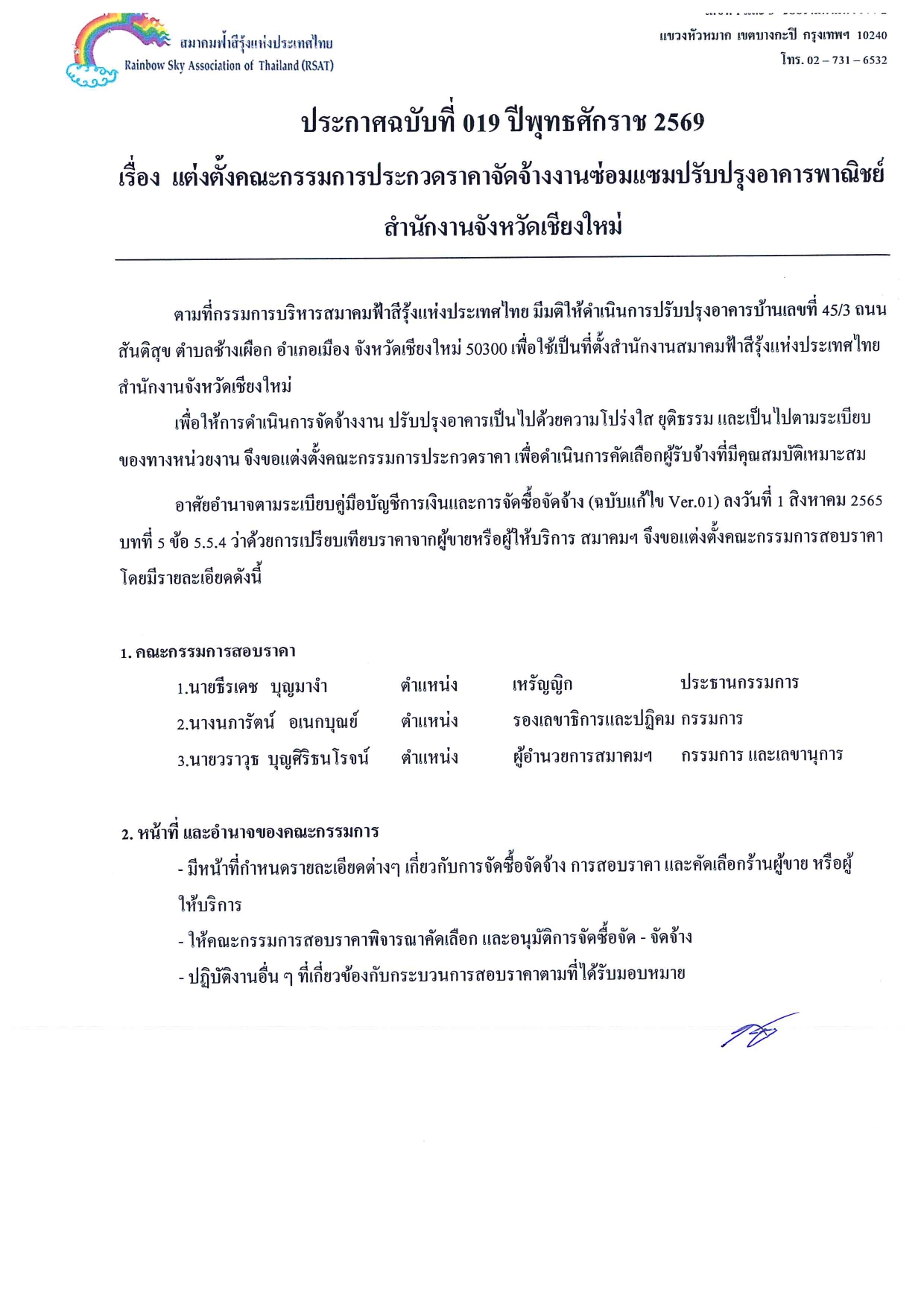 10/03/2026เรื่อง แต่งตั้งคณะกรรมการประกวดราคาจัดจ้างงานซ่อมแซมปรับปรุงอาคารพาณิชย์ เลขที่ 45/3 ถนนสัรติสุข ตำบลช้างเผือก อำเภอเมือง จังหวัด เชียงใหม่