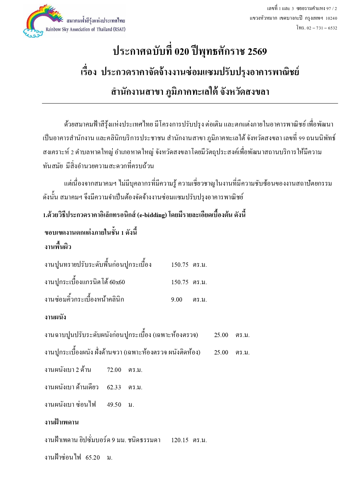สมาคมฟ้าสีรุ้งแห่งประเทศไทย มีโครงการปรับปรุง ต่อเติม และตกแต่งภายในอาคารพาณิชย์ เพื่อพัฒนาเป็นอาคารสำนักงาน และคลินิกบริการประชาชน สำนักงานสาขา ภูมิภาคทะเลไต้ จังหวัดสงขลา เลขที่ 99 ถนนนิพัทธ์สงเคราะห์ 2 ตำบลหาดใหญ่ อำเภอหาดใหญ่ จังหวัดสงขลา