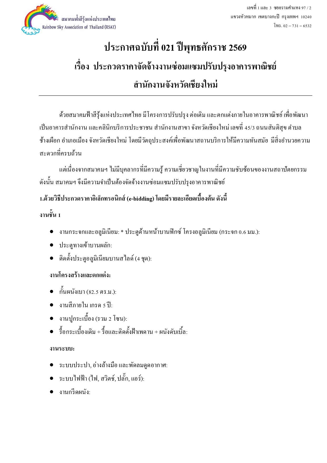 สมาคมฟ้าสีรุ้งแห่งประเทศไทย มีโครงการปรับปรุง ต่อเติม และตกแต่งภายในอาคารพาณิชย์ เพื่อพัฒนาเป็นอาคารสำนักงาน และคลินิกบริการประชาชน สำนักงานสาขา จังหวัดเชียงใหม่ เลขที่ 45/3 ถนนสันติสุข ตำบลช้างเผือก อำเภอเมือง จังหวัดเชียงใหม่ โดยมีวัตถุประสงค์เพื่อพัฒนาสถานบริการให้มีความทันสมัย มีสิ่งอำนวยความสะดวกที่ครบถ้วน