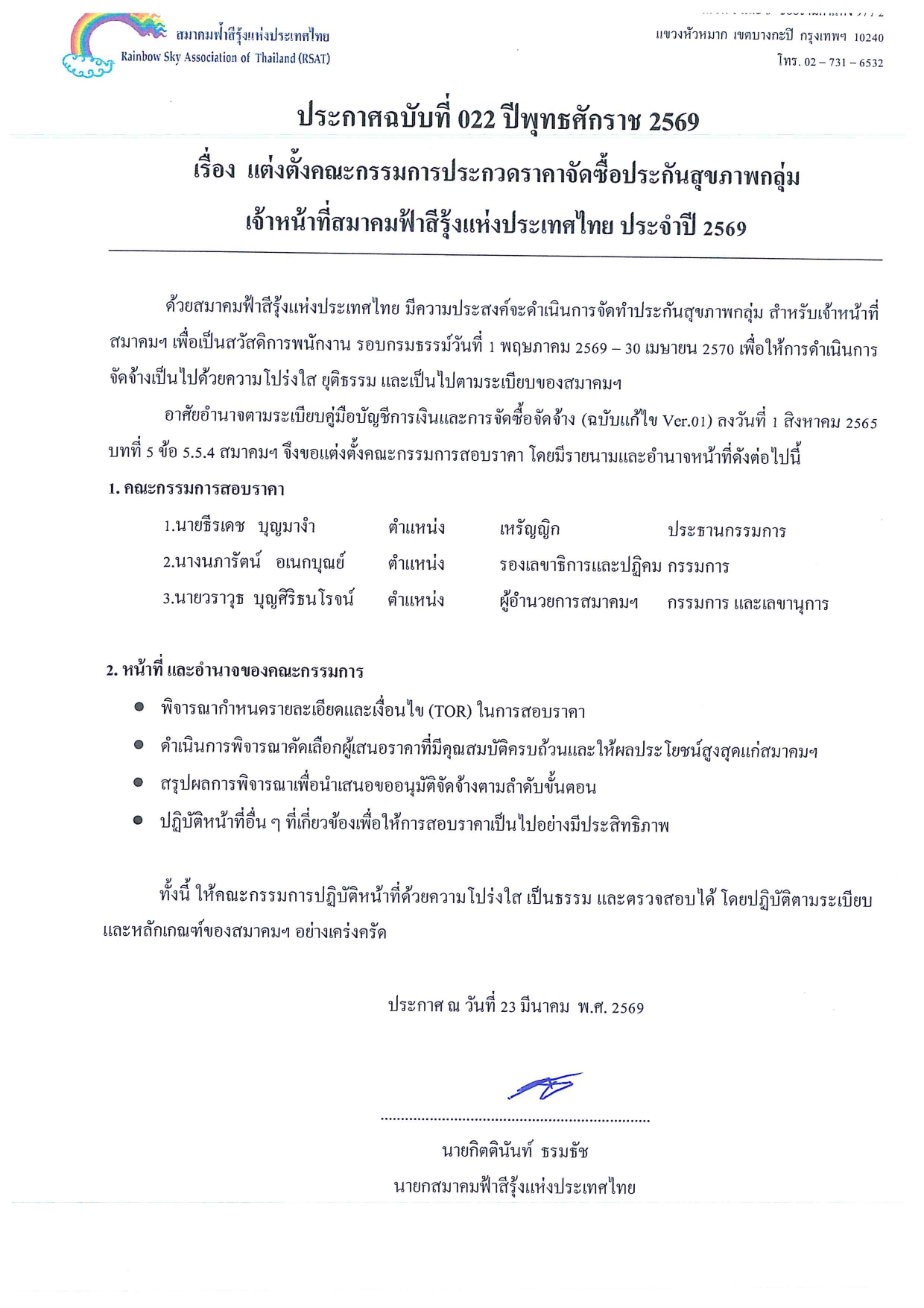 เรื่อง แต่งตั้งคณะกรรมการประกวดราคาจัดซื้อประกันสุขภาพกลุ่ม เจ้าหน้าที่สมาคมฟ้าสีรุ้งแห่งประเทศไทย ประจำปี 2569