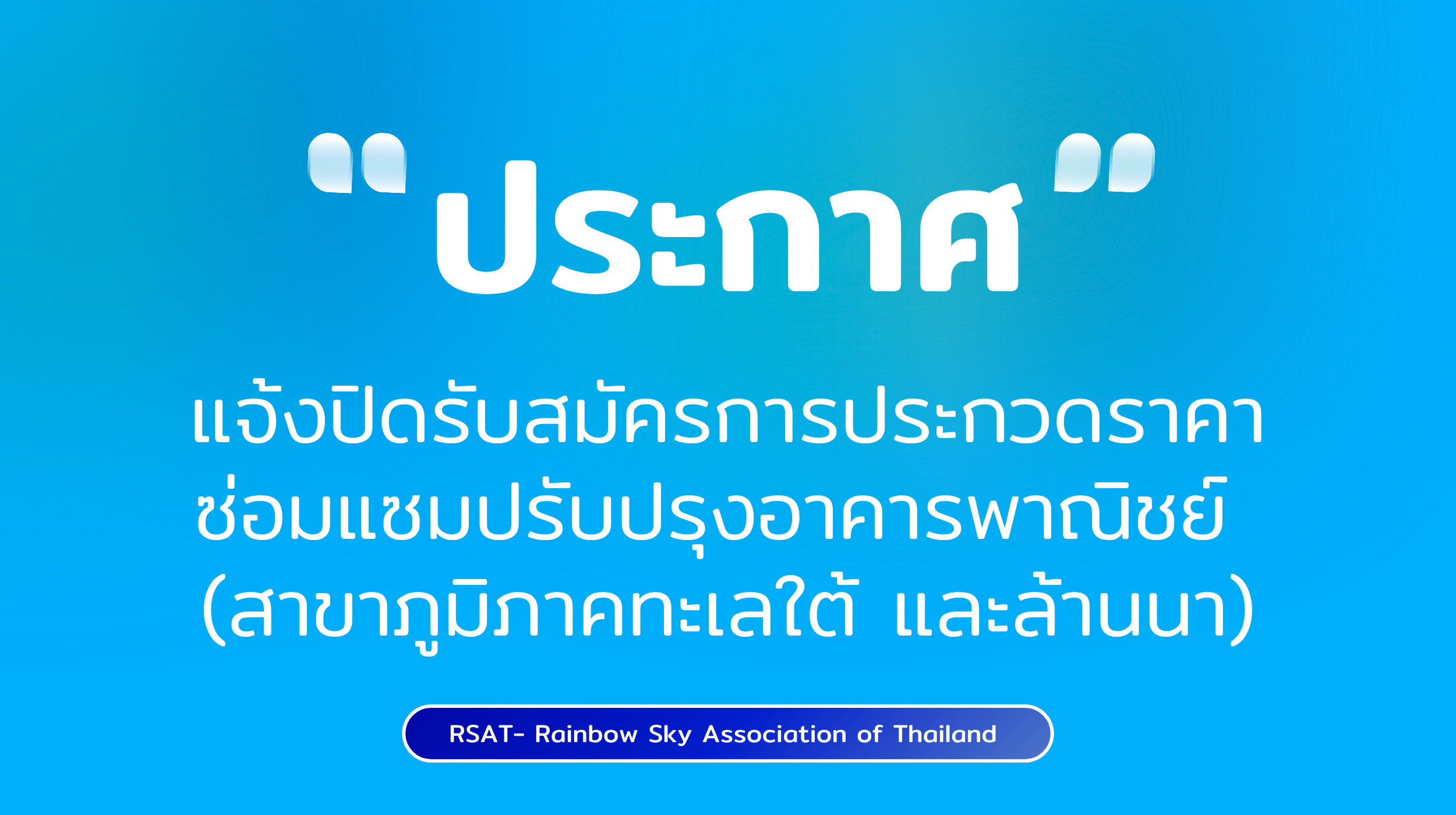 ตามที่ สมาคมฟ้าสีรุ้งแห่งประเทศไทย (RSAT) ได้มีประกาศฉบับที่ 020/2569 และ 021/2569 ลงวันที่ 9 มีนาคม 2569 เรื่อง ประกวดราคาจัดจ้างงานซ่อมแซมปรับปรุงอาคารพาณิชย์ สำนักงานสาขาภูมิภาคทะเลใต้ จังหวัดสงขลา และสำนักงานล้านนา จังหวัดเชียงใหม่