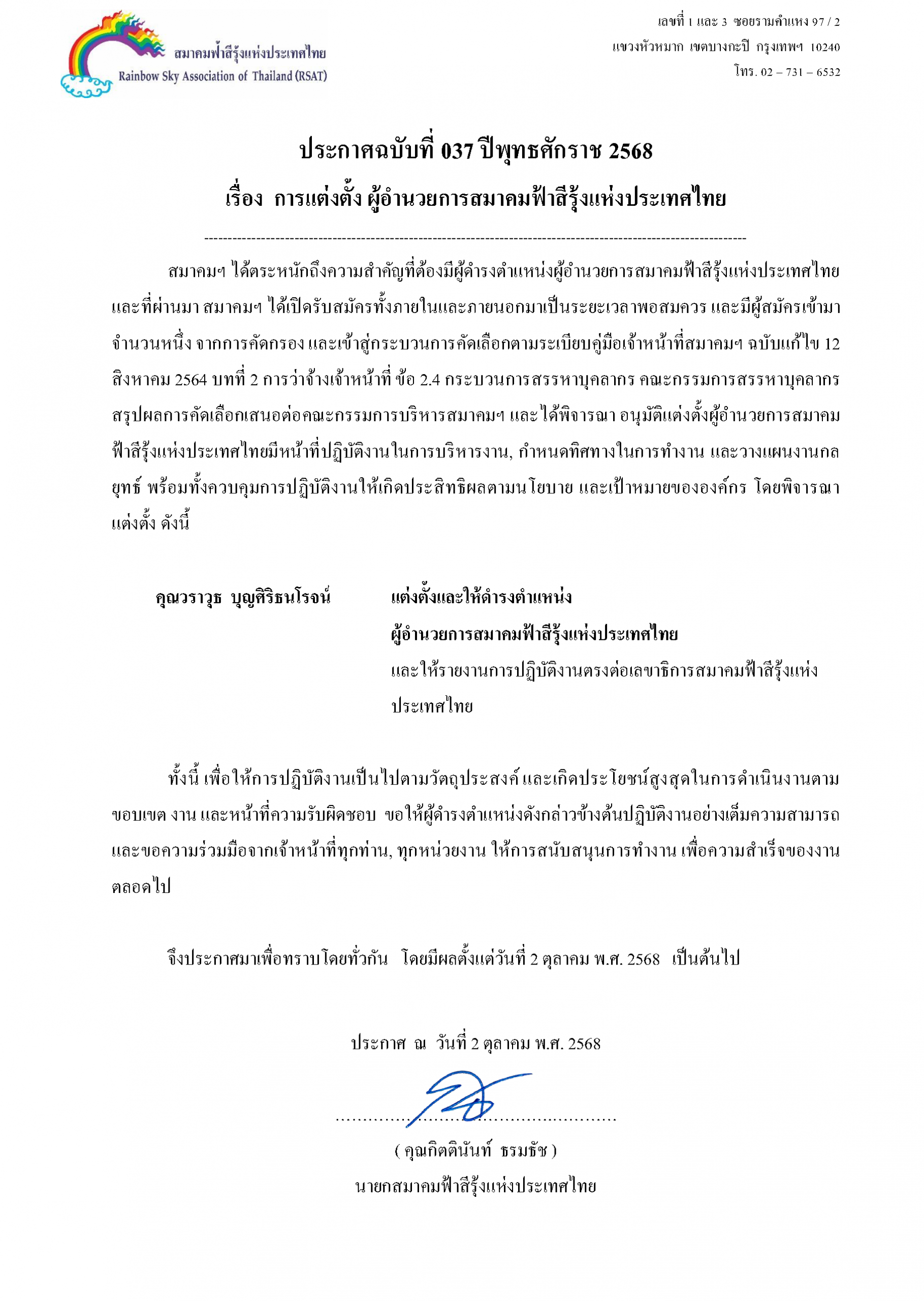 เรื่อง การแต่งตั้ง ผู้อำนวยการสมาคมฟ้าสีรุ้งแห่งประเทศไทย